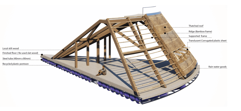 The floating platform integrates direct water access, enabling mobile, community-based learning and ensuring year-round accessibility across both dry and rainy seasons.